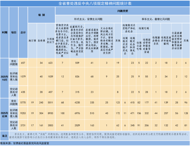 11月11日,甘肃省纪委监委公布了2025年10月全省查处违反中央八项规定精神问题汇总情况。当月,全省共查处违反中央八项规定精神问题657起,批评教育和处理1079人,其中党纪政务处分435人。